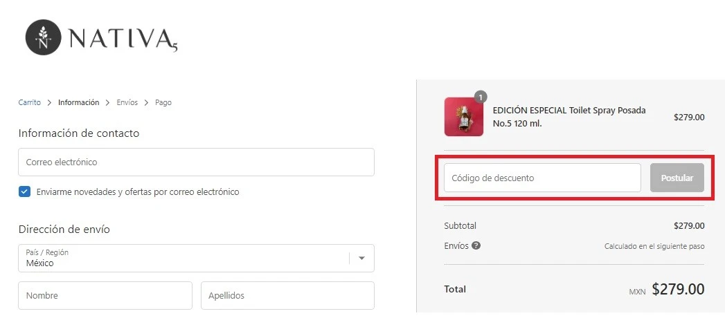 Es muy fácil canjear los Códigos Descuento Nativa5. Primero, elige el cupón de tu preferencia y dale clic donde dice “ver cupón” para así copiar el código alfanumérico con la herramienta “copy”. Después, dale clic al link que dice “visita la tienda”, para que entres al portal de Nativa5. Agrega a la bolsa de compra todo lo que quieras llevar y, al pagar, “pega” el código alfanumérico para aplicar el descuento.